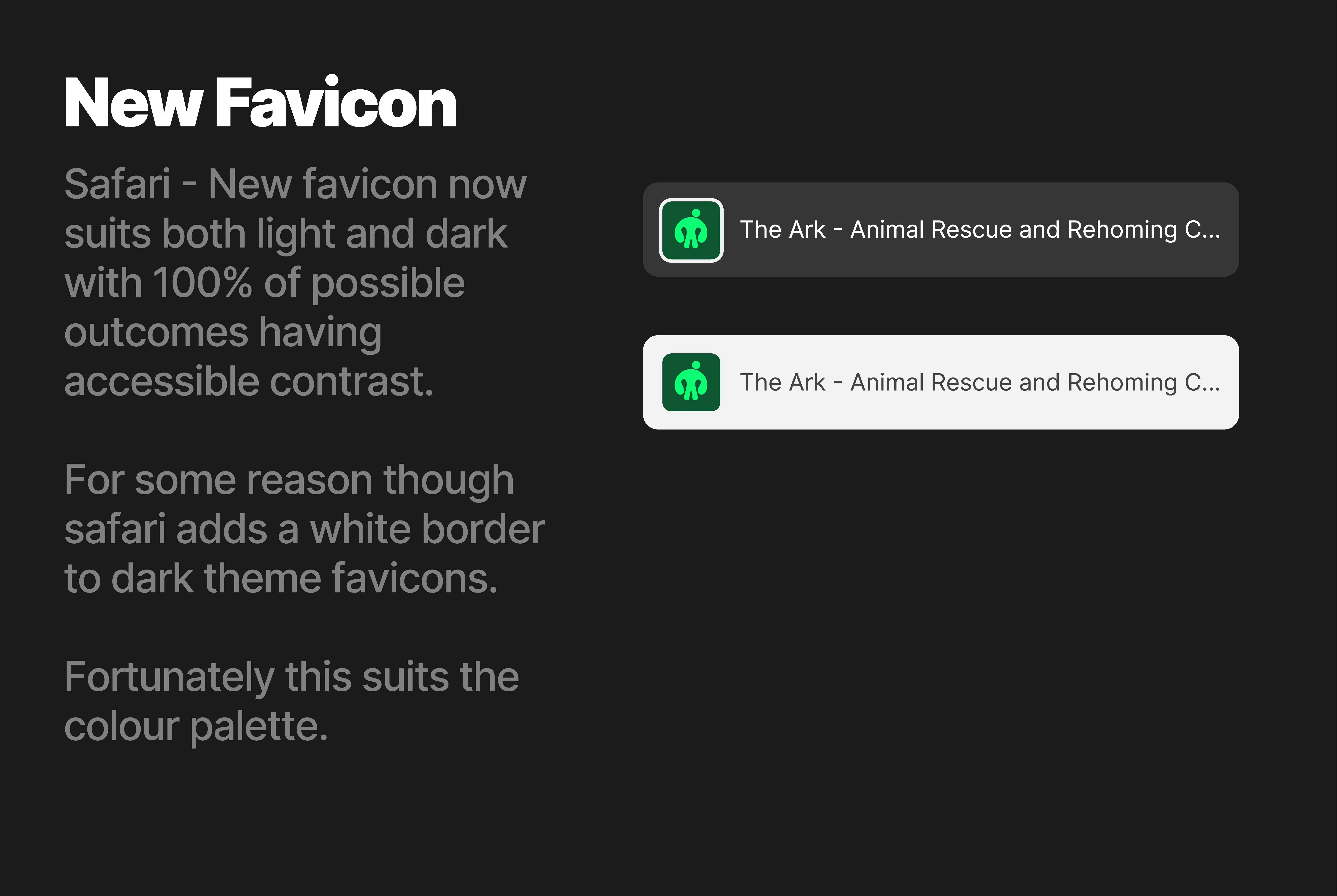 A simple solution was to add the highlight green icon on the green background so there was contrast within the favicon. This means if its displayed on a dark background, the icon still has contrast. If its on a light background, the background still has contrast. Impenetrable.