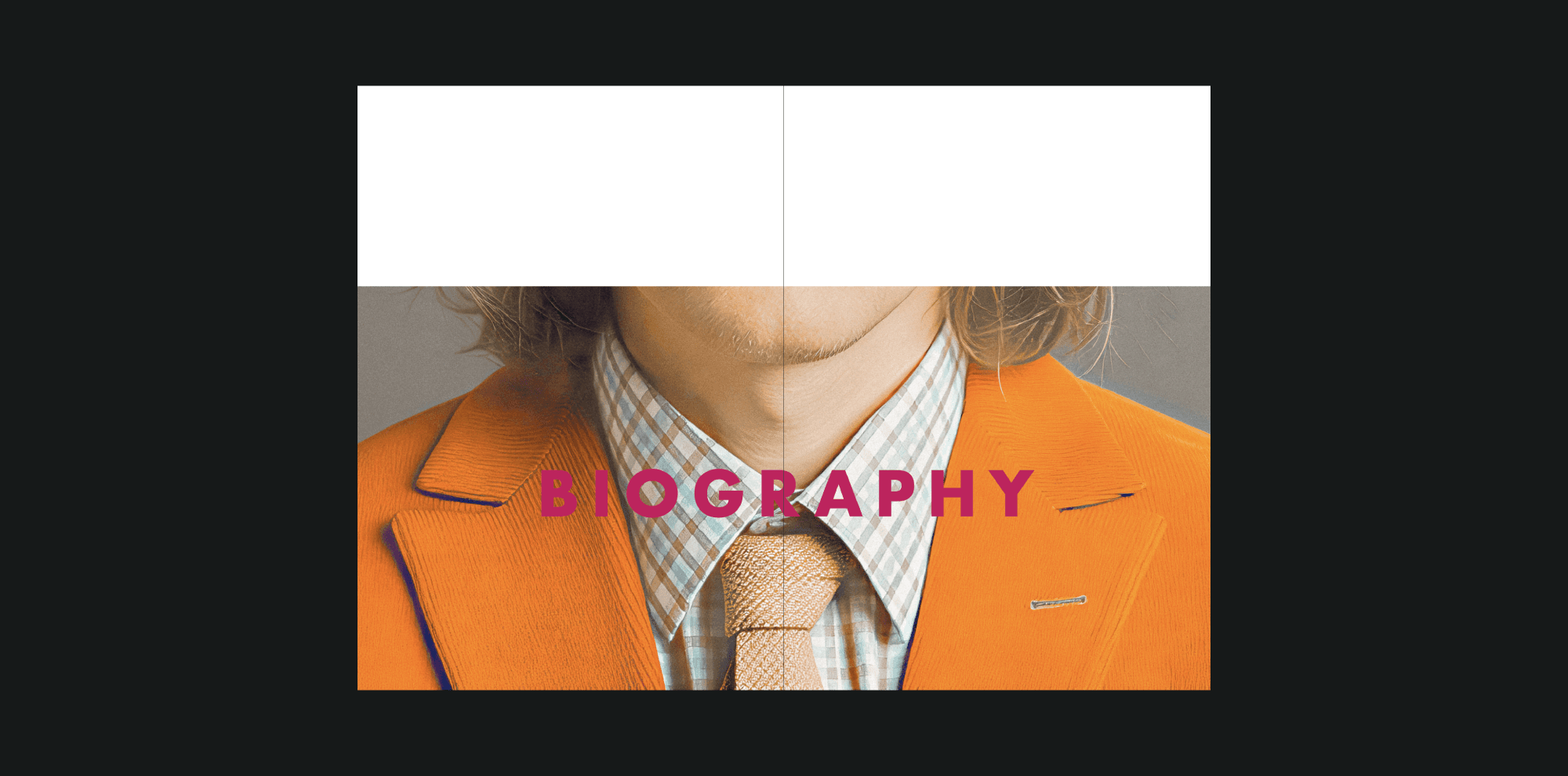 Since the split-type approach no longer worked without adding unnecessary content, I opted instead to place the title Biography in Archer Ultra across the bottom of the spread, set in a pastel pink reminiscent of Anderson’s signature colour palette.