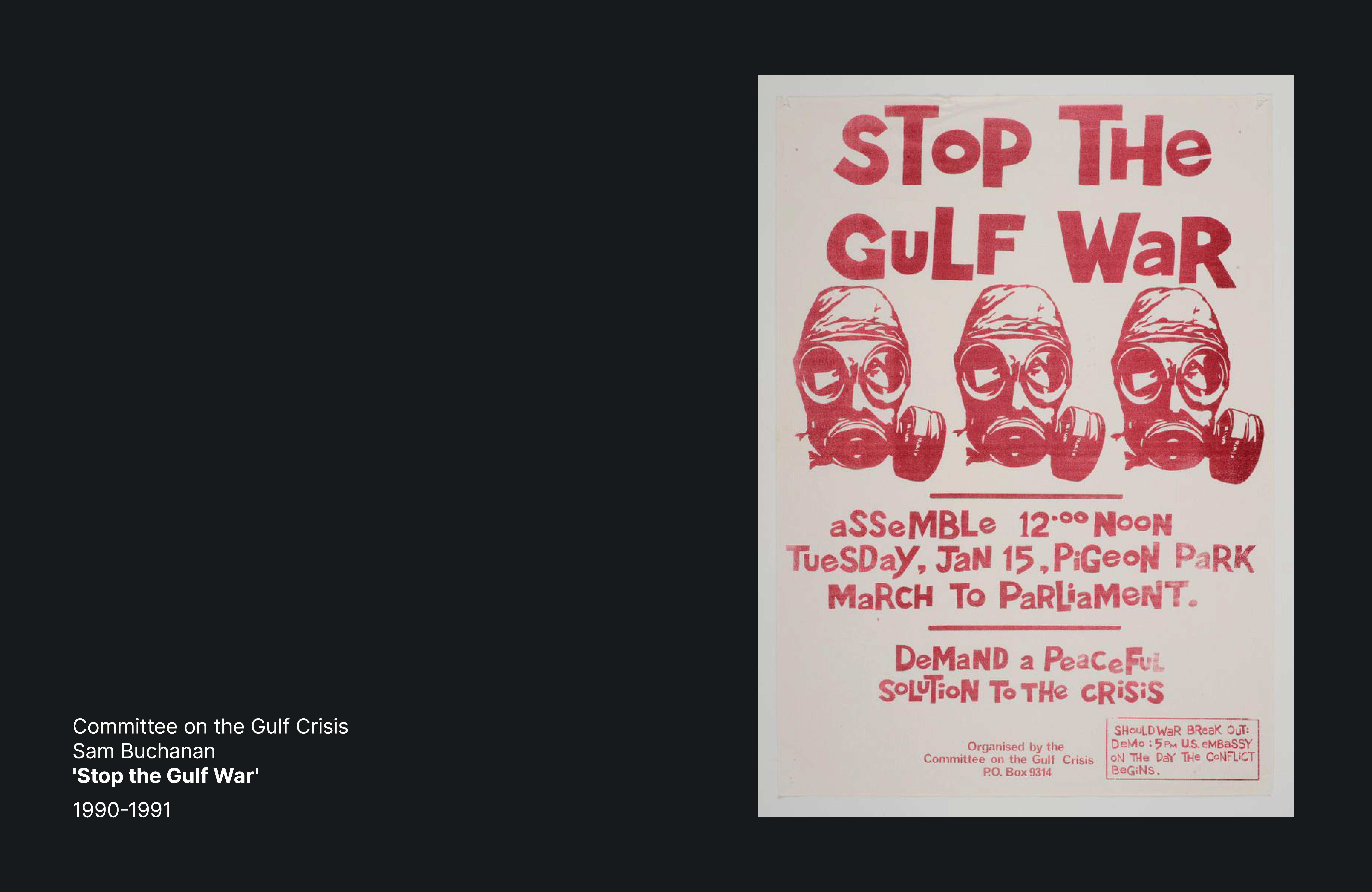 The 1990s Gulf War poster moves in the opposite direction. Raw, hand rendered, and decentralised design communicates the grassroots activism and DIY aesthetic of street protest culture. It prioritises immediacy and participation over formal design.