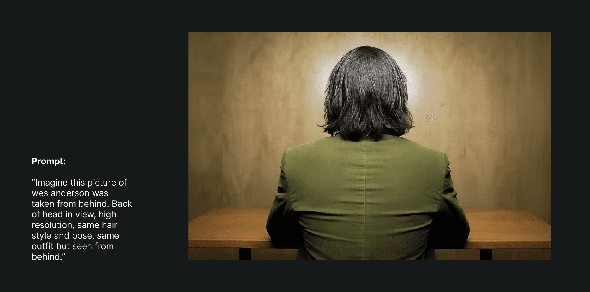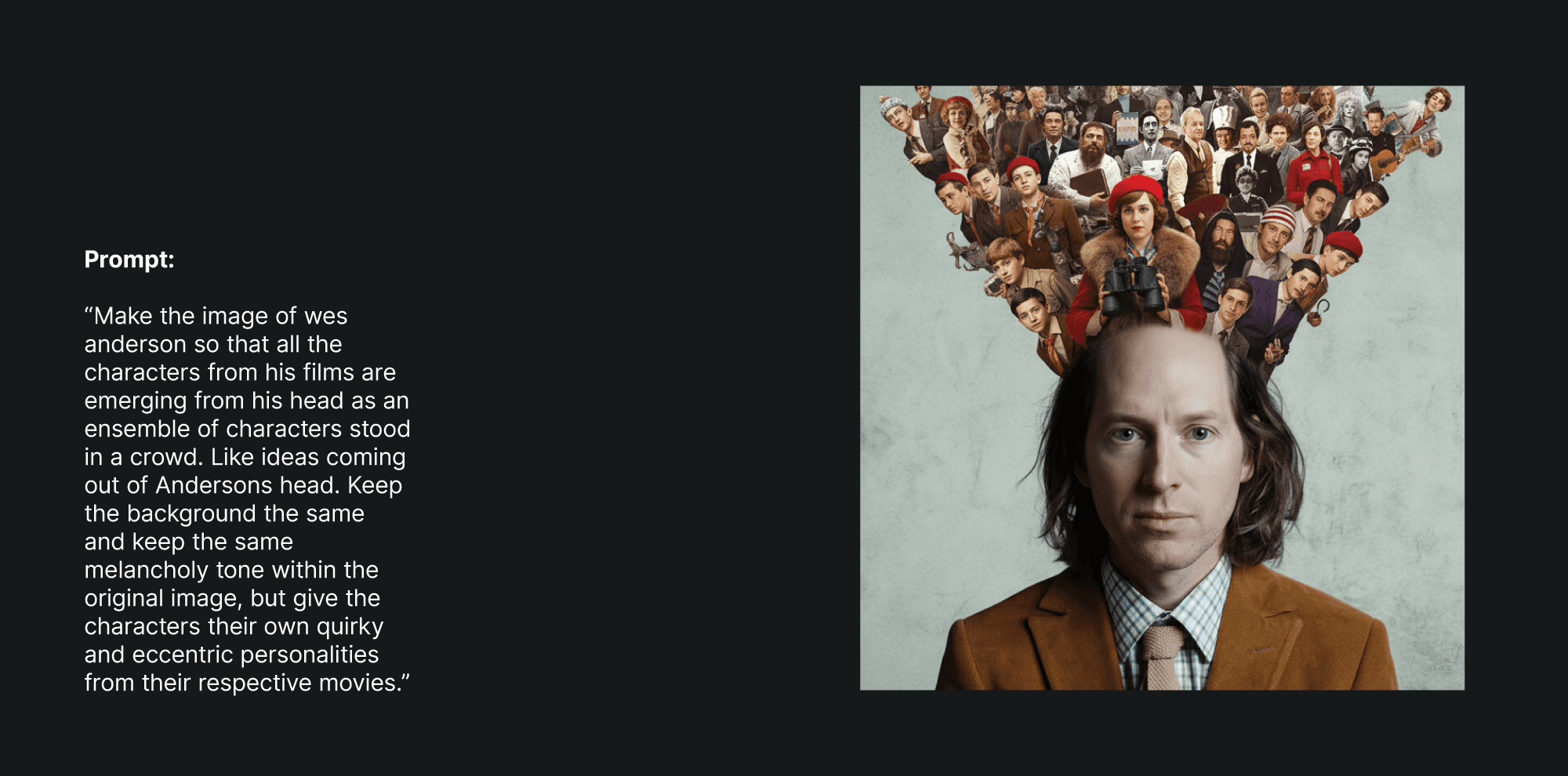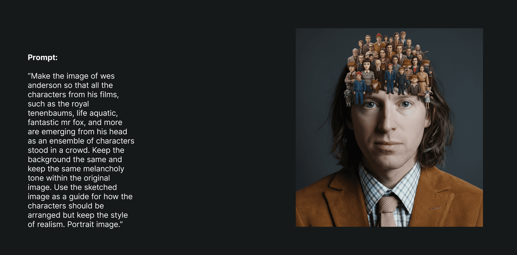 The first edit I made was cropping the image and giving Anderson a perfect deadpan facial expression which went incredibly well. The next step was to add the ensemble of Anderson's movie characters standing together as if they were poking out of his head (as shown in the sketch). This part went terribly. Although AI is pretty impressive now, it couldn't quite grasp the concept as it struggled to identify and recreate all the characters and further struggled to arrange them in the way I wanted it to. Unfortunately this meant I had to go with a different idea.