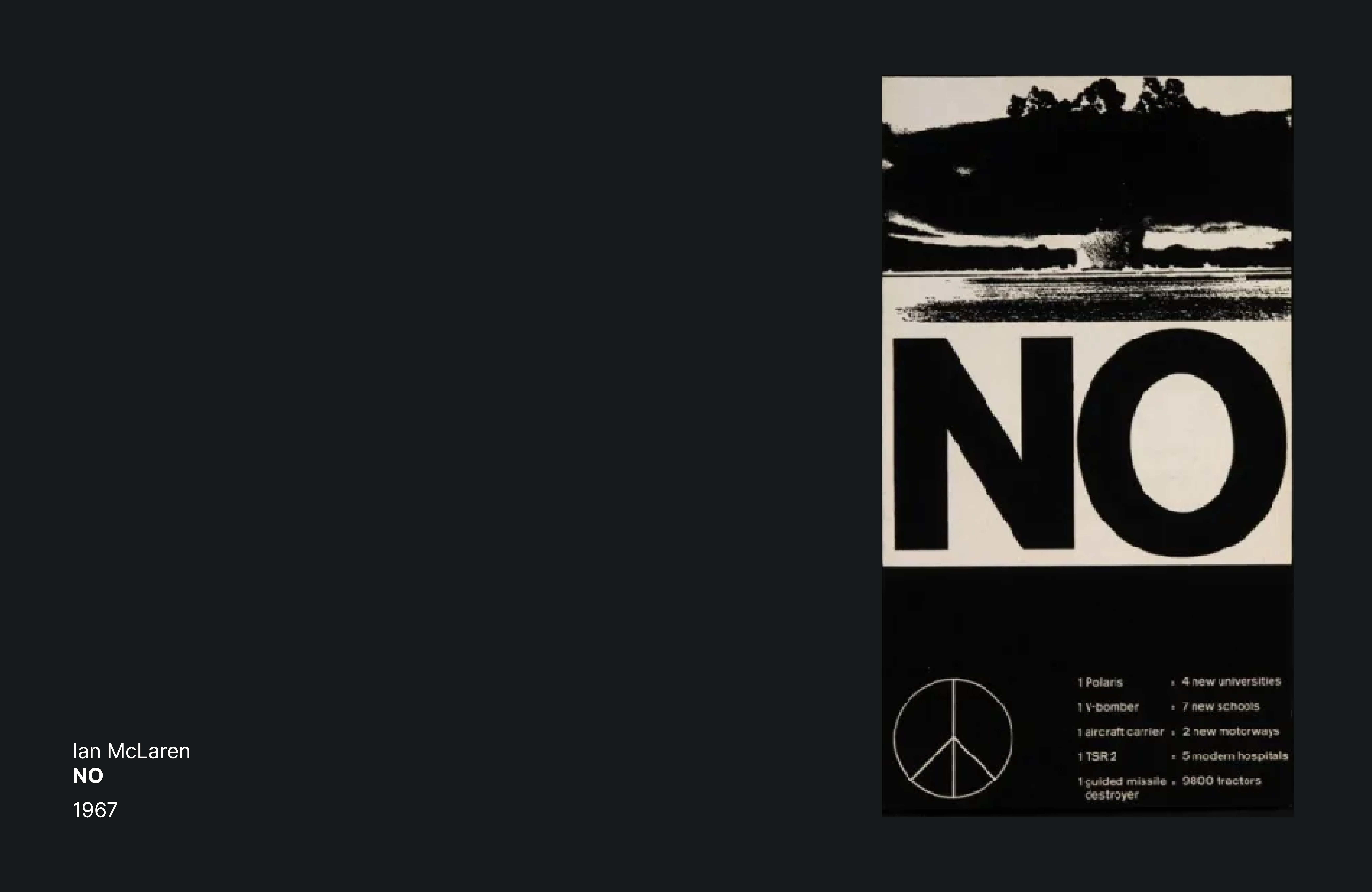 McLaren’s poster is pure reduction. Everything is stripped to high contrast black and off white, with three stacked zones. At the top, a stark, almost abstracted photograph of a mushroom cloud across the horizon establishes the subject without explanatory text. The middle band is dominated by the word “NO” in large geometric sans serif letters, a blunt typographic element that functions as type and image simultaneously. The lower black block contains a fine-line peace symbol and small, rational text comparing the cost of weapons to social spending. The layout is rigidly vertical and architectural, using scale to utterly refuse the idea of nuclear war whilst giving a supporting argument as to why (how funding can be used for good rather than war).