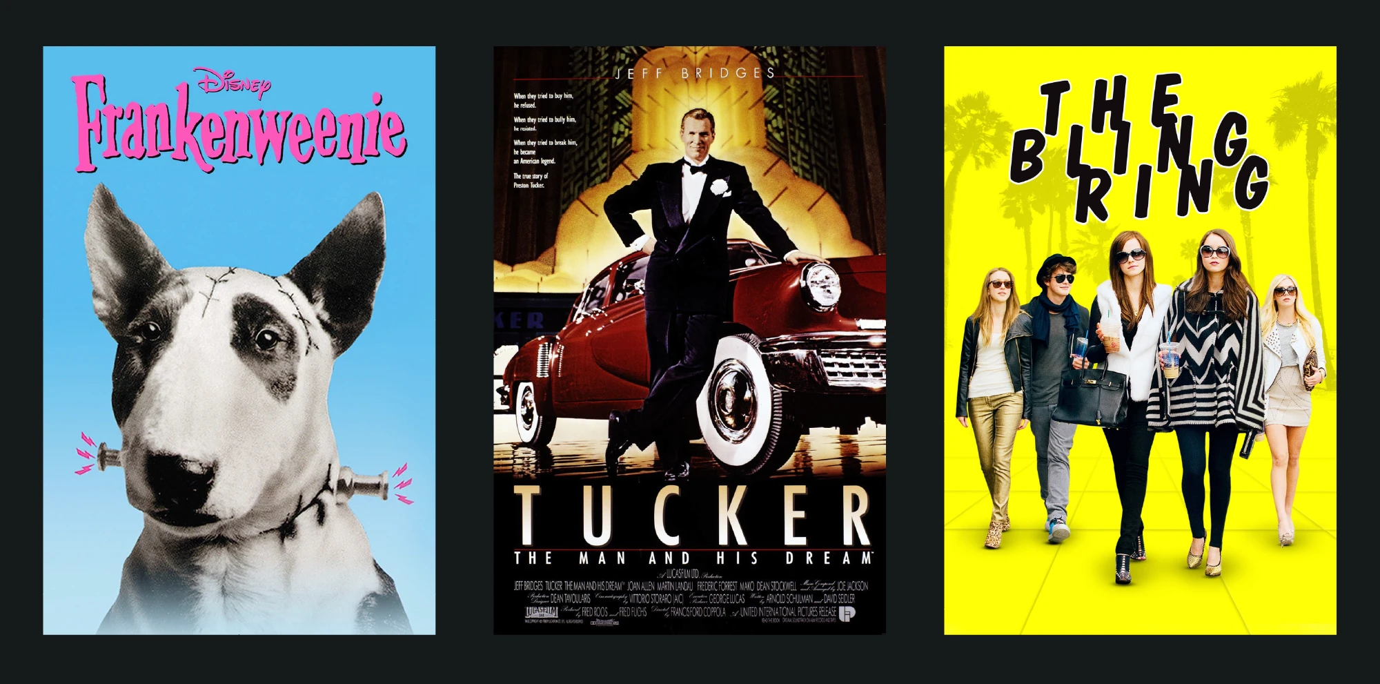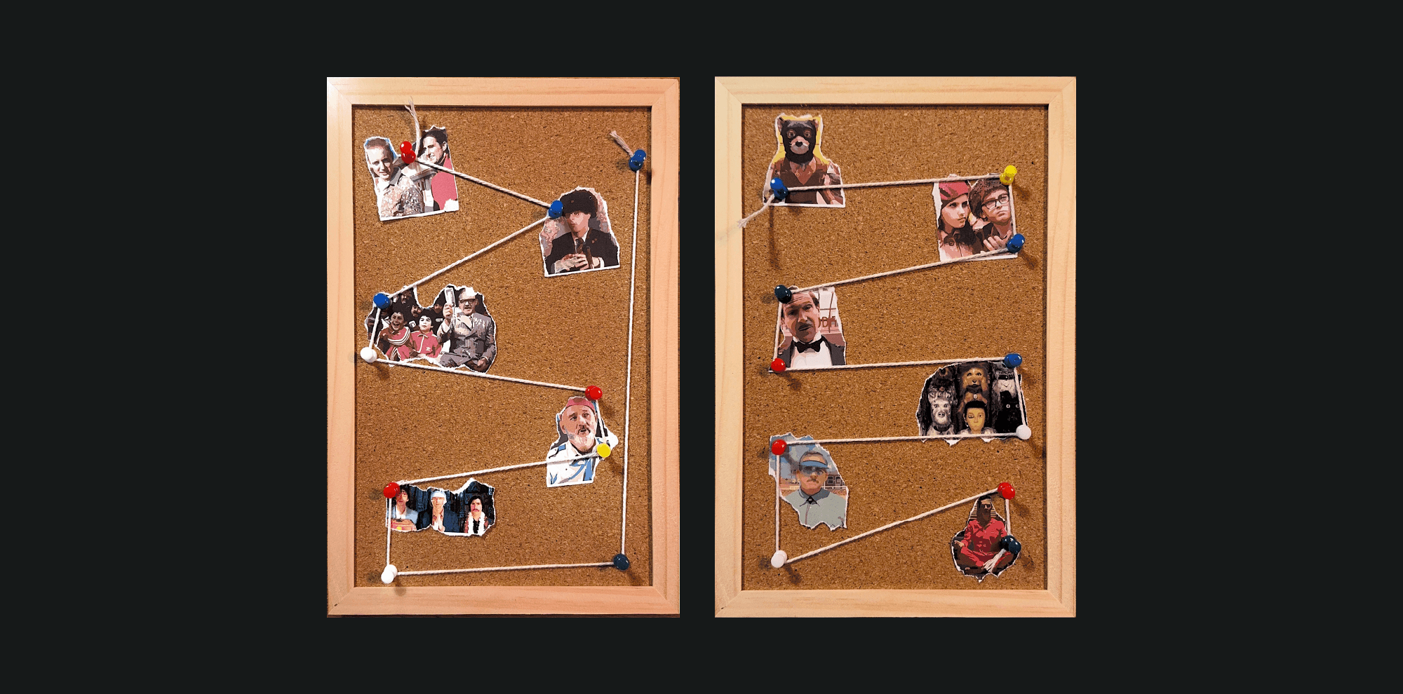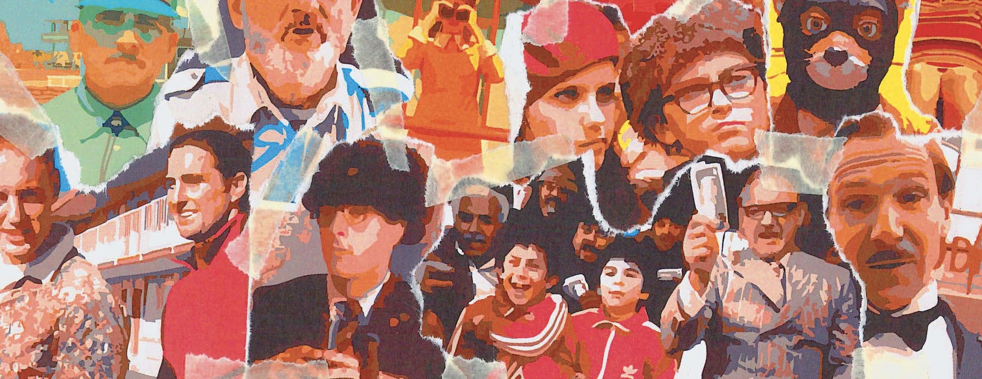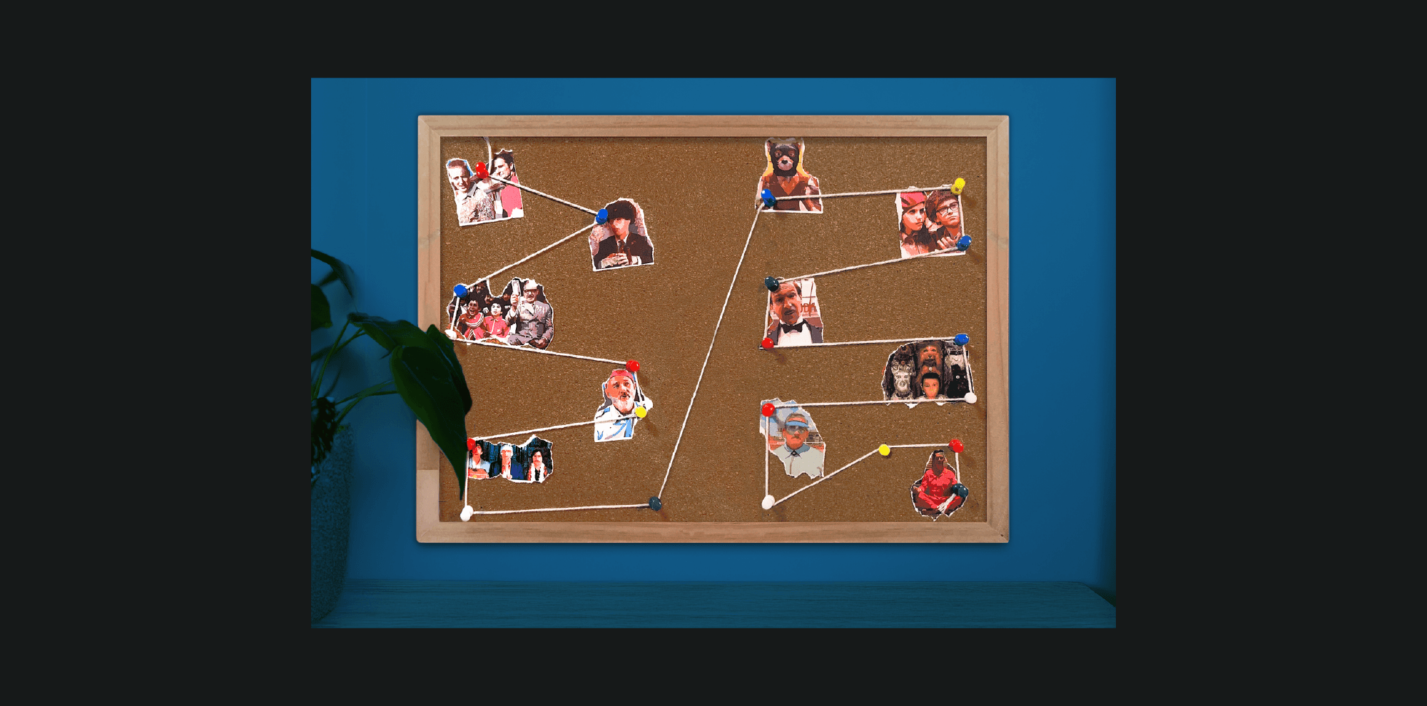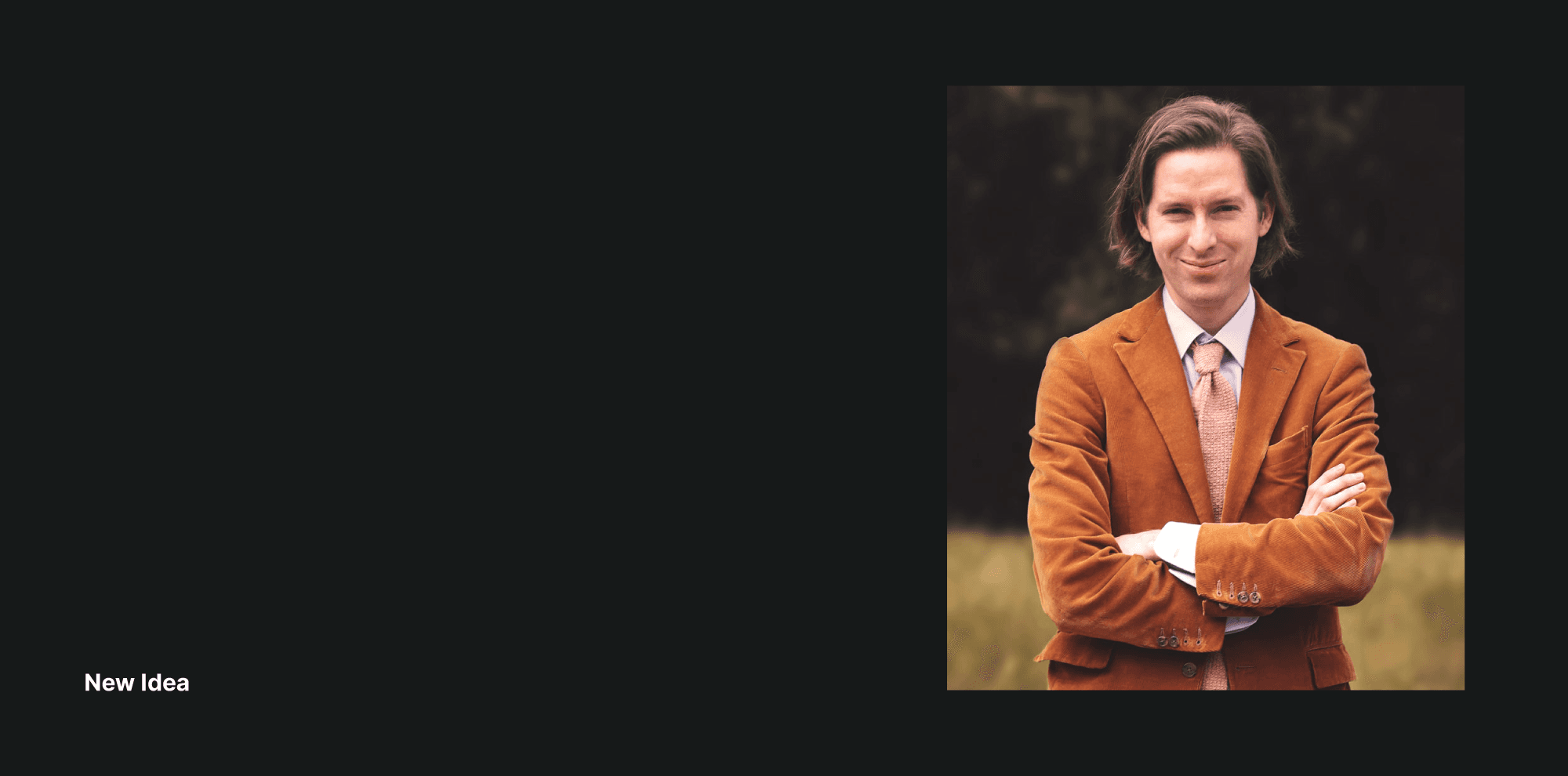 Using the established split-type design, I created filled the top and bottom quarters with the relevant information. Then for the images, which would sit central to the composition, I attempted to find an ensemble of Wes' movie characters and a new image of Wes that didn't directly show his face. I settled on a picture of Wes facing the camera but this broke the rule. I used generative AI to recreate the image as if it was taken from behind and this worked perfectly. After some refinement, I had my image. For the character ensemble, there was no images of all of them together. Only ensembles of particular movies, and not all of them.