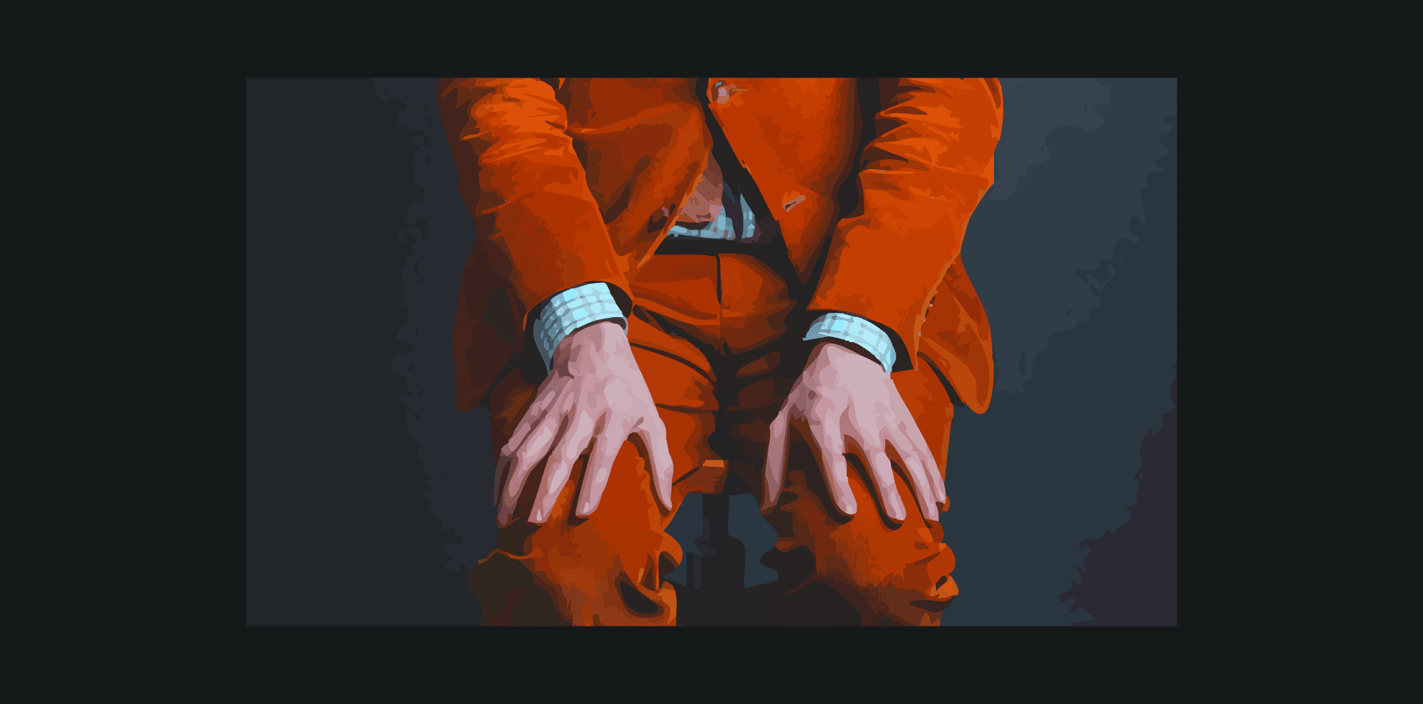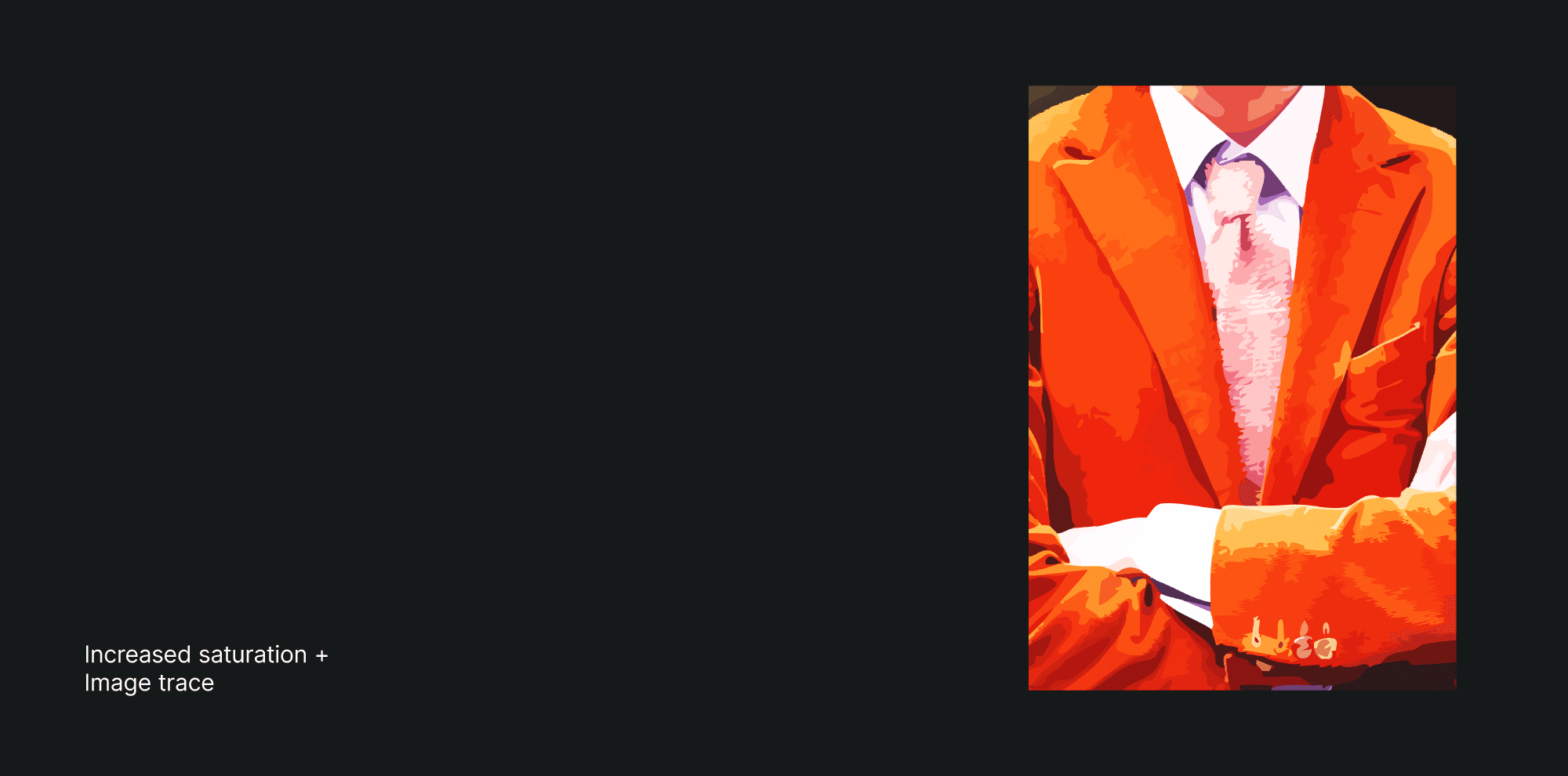 I also wanted to avoid relying on the same portrait repeatedly, especially once I decided not to show his face prominently in the magazine. Instead, I chose an image of his hands resting on his knees as the focal point. This allowed me to wrap the text around his arms, positioning the copy neatly on either side of the page while keeping the visual unobstructed. I applied the same image-trace style as used elsewhere and boosted the saturation for consistency.
