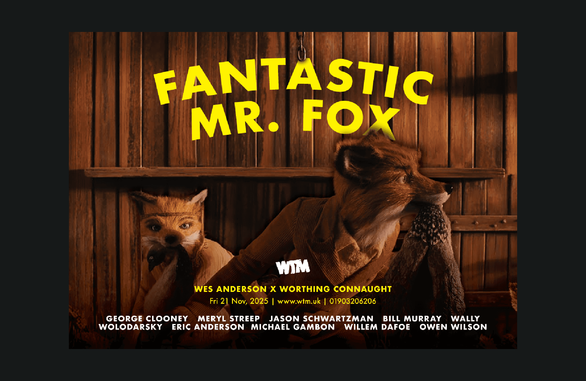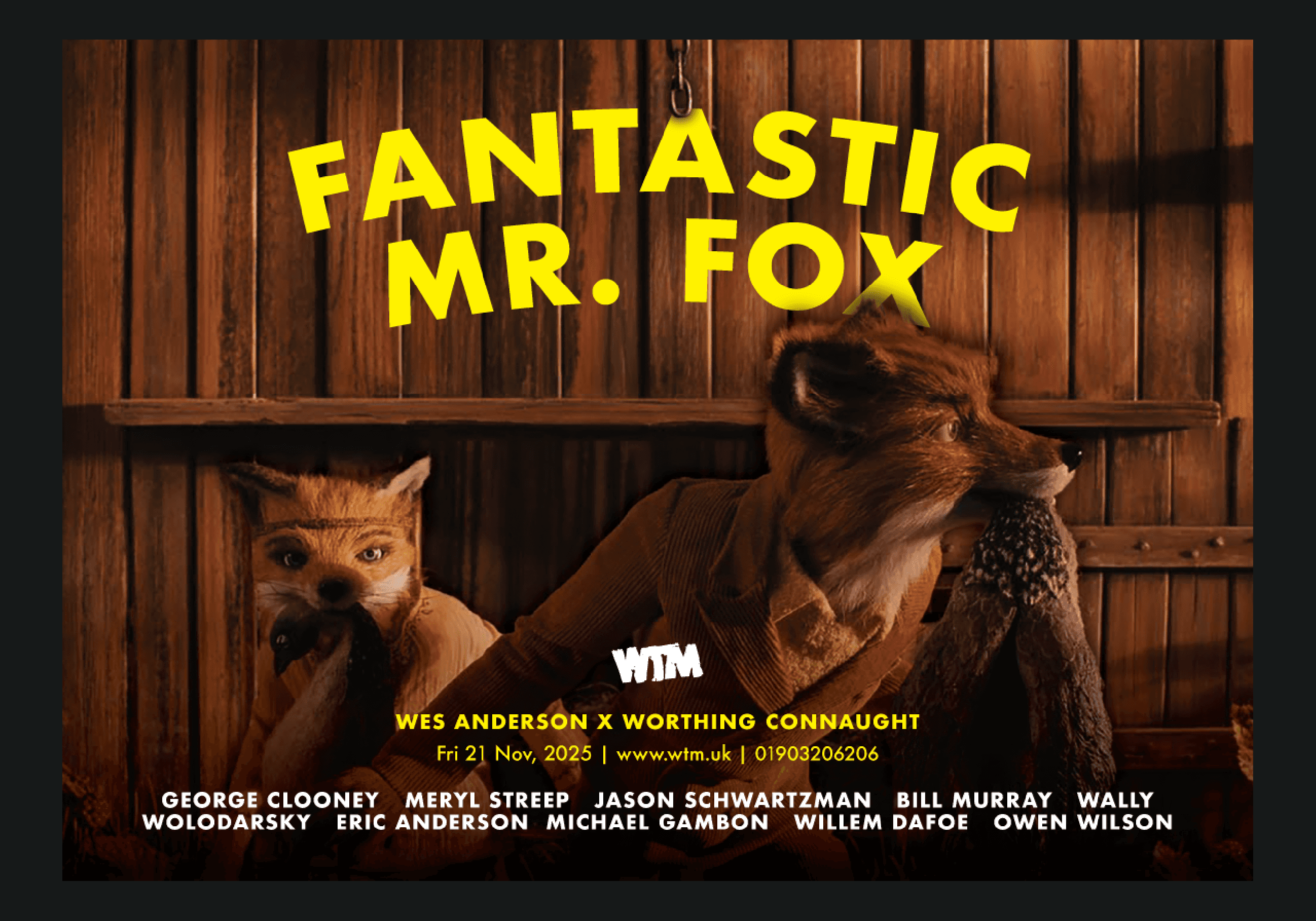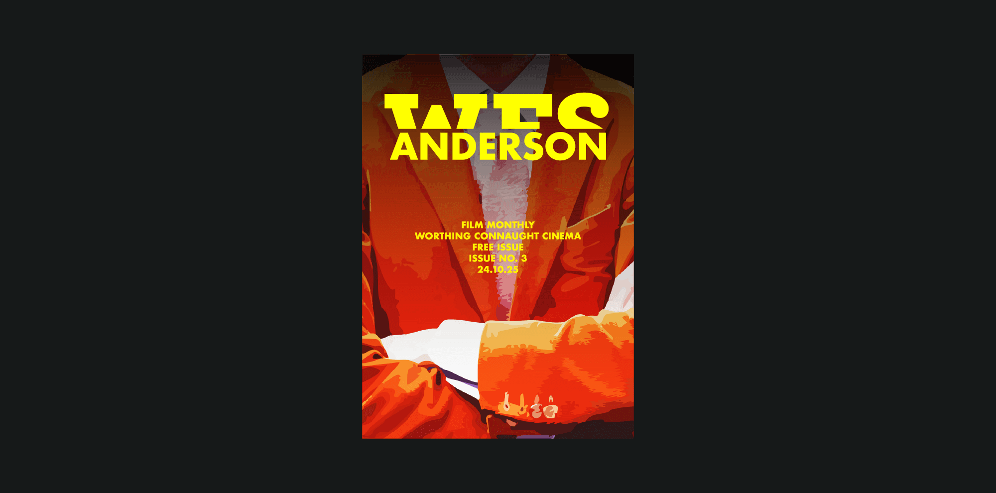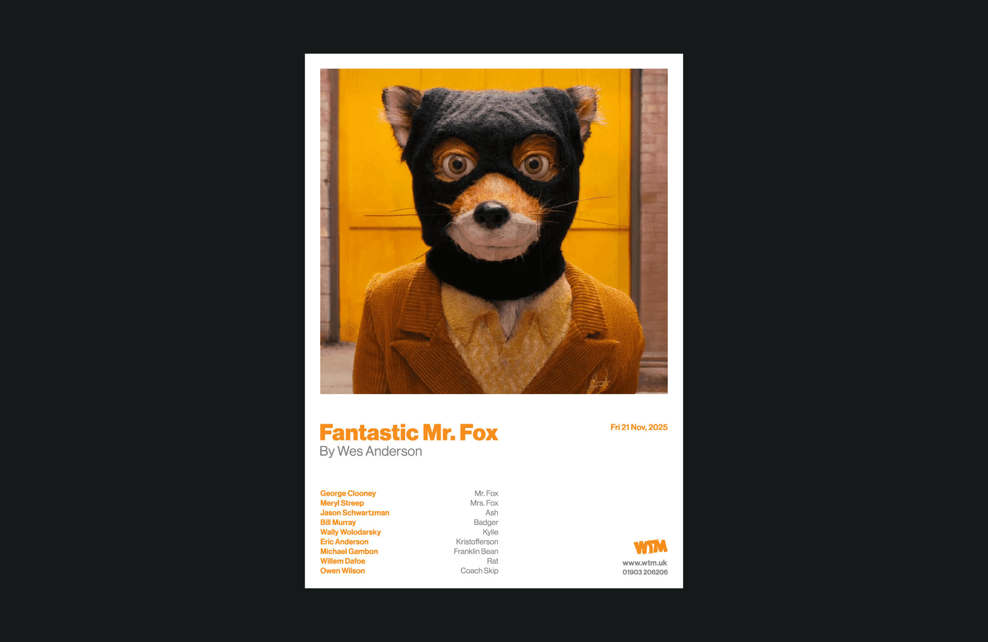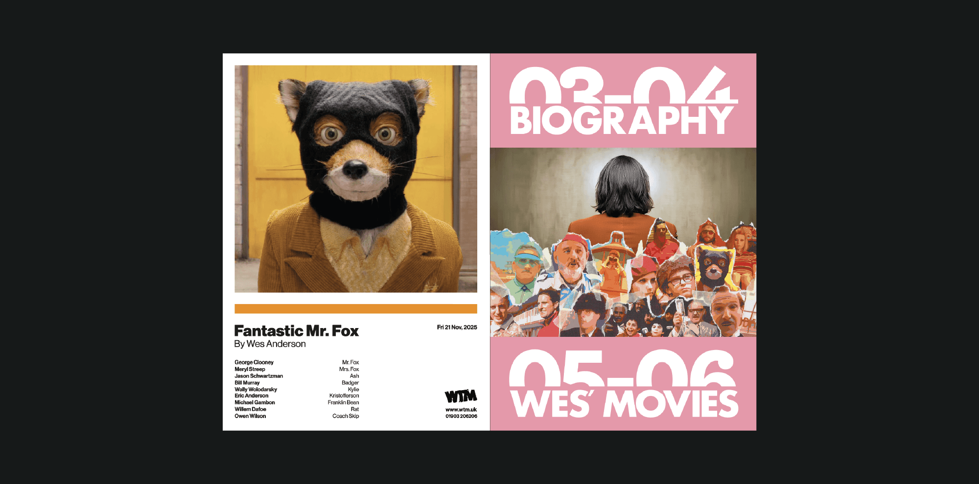 I removed the 10mm tall columns entirely. Then, I added the movie title, "By Wes Anderson", cast and the characters they played, the Worthing Theatre and Museums logo + contact details, and date. I used the same type hierarchy as this was already effective, but I utilised Helvetica Medium, Bold, and Regular this time.