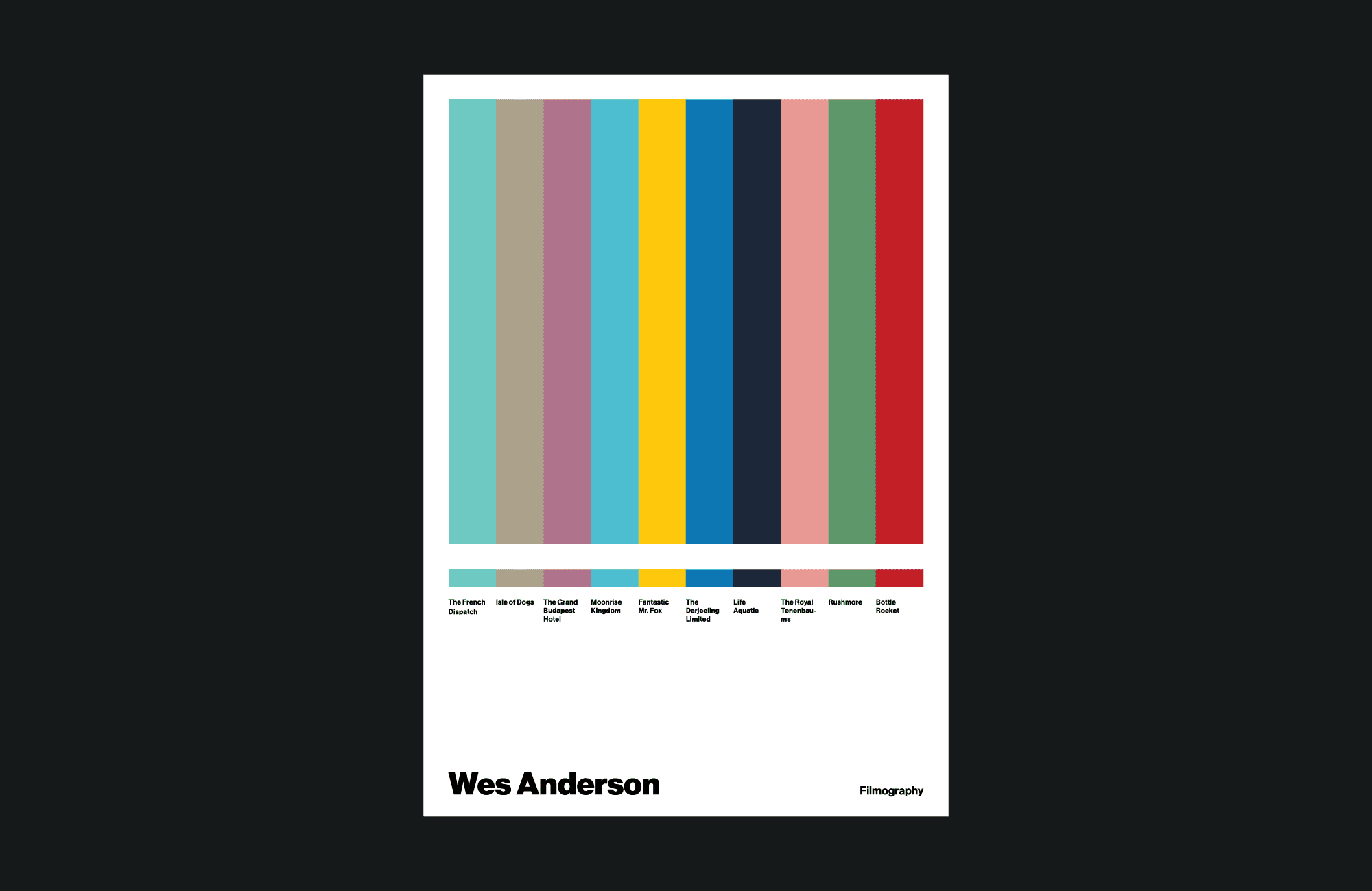 Then, using Helvetica, I added my typography. I added the name of every movie, left aligned with their respective column. In the bottom left of the page, I added the title "Wes Anderson" and the subtitle "Filmography" in the bottom right. The type hierarchy was established by taking my body text size and multiplying it by the golden ratio (1.618) four times to give me various text sizes. The smallest for body, next size up for subtitle, skip the next, and then the largest size for the heading to make sure it's significantly bigger than the subtitle.