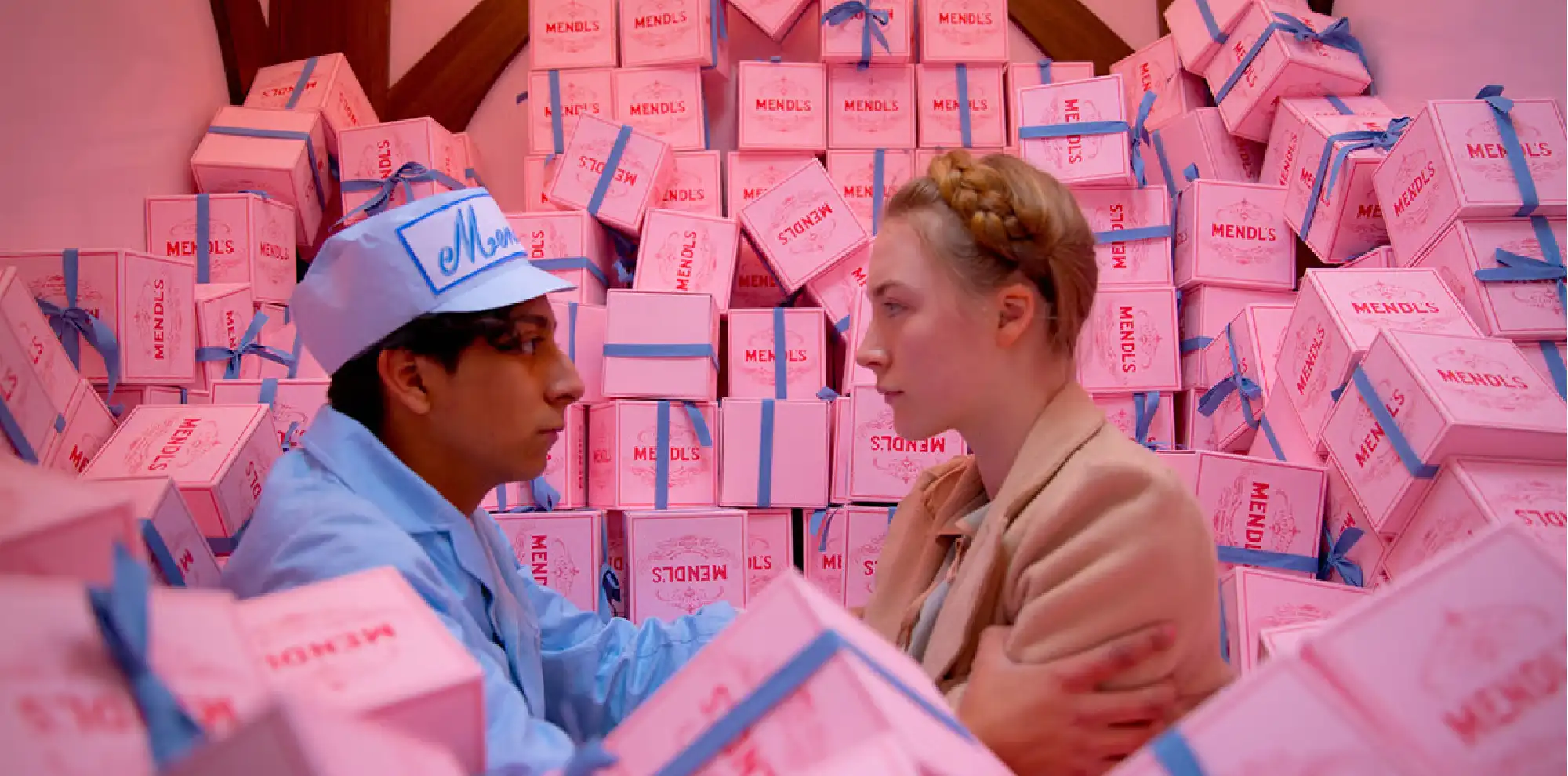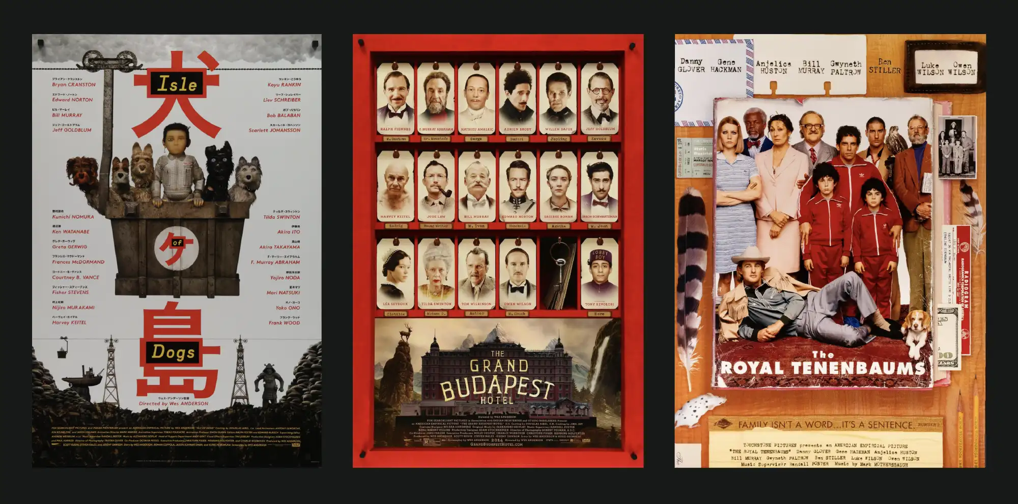 Distinct monochromatic environments per film (for example, pink in The Grand Budapest Hotel or mustard yellow in Moonrise Kingdom)