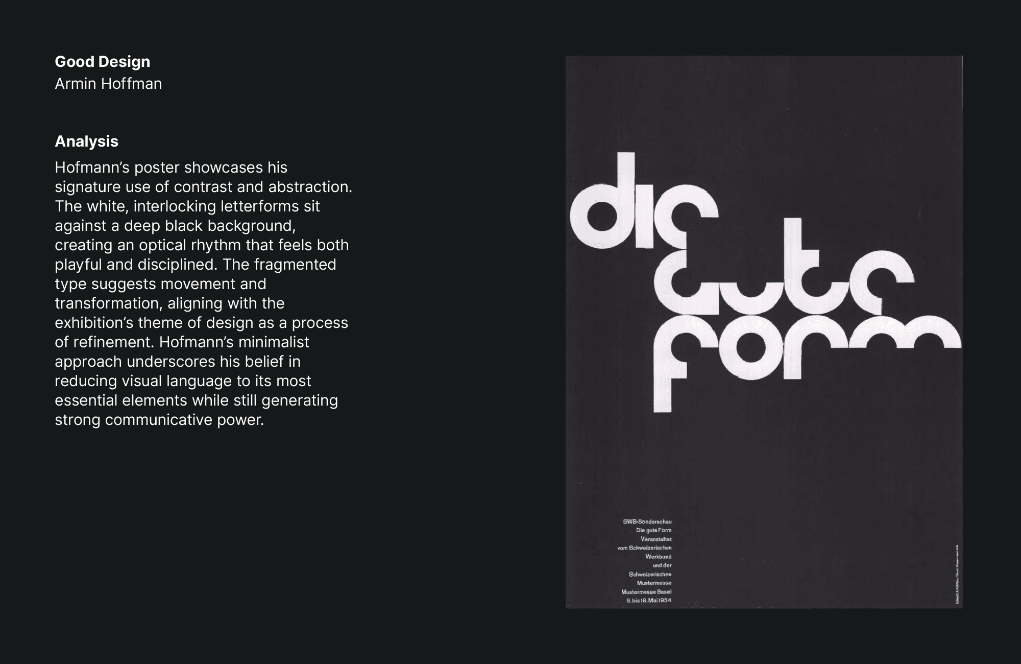 Influential designers such as Müller-Brockmann, Hofmann, Ruder, Max Bill, and later Wim Crouwel all helped shape the movement, each adding their own emphasis. Some pushed for pure geometric order, others focused on typography or on the creation of coherent corporate identity systems. What united them was the belief that design should be honest and functional, and that effective communication depends on clarity rather than ornament.
