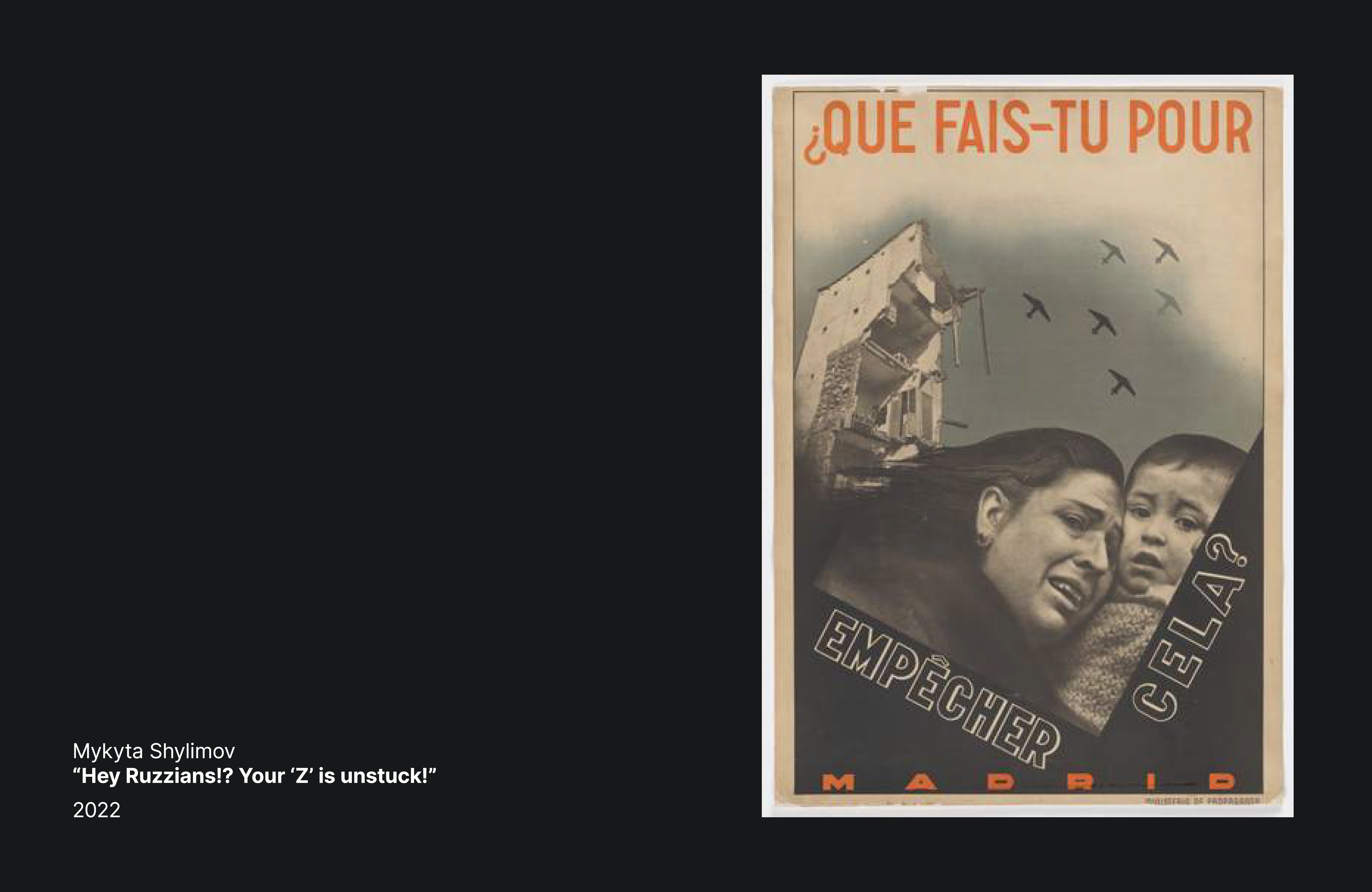 The present-day Ukrainian poster returns to conceptual clarity but with contemporary digital precision. Created by displaced designers, it draws power from symbolic equivalence by folding a Nazi swastika into the modern Russian “Z” military symbol to warn of recurring authoritarian aggression.