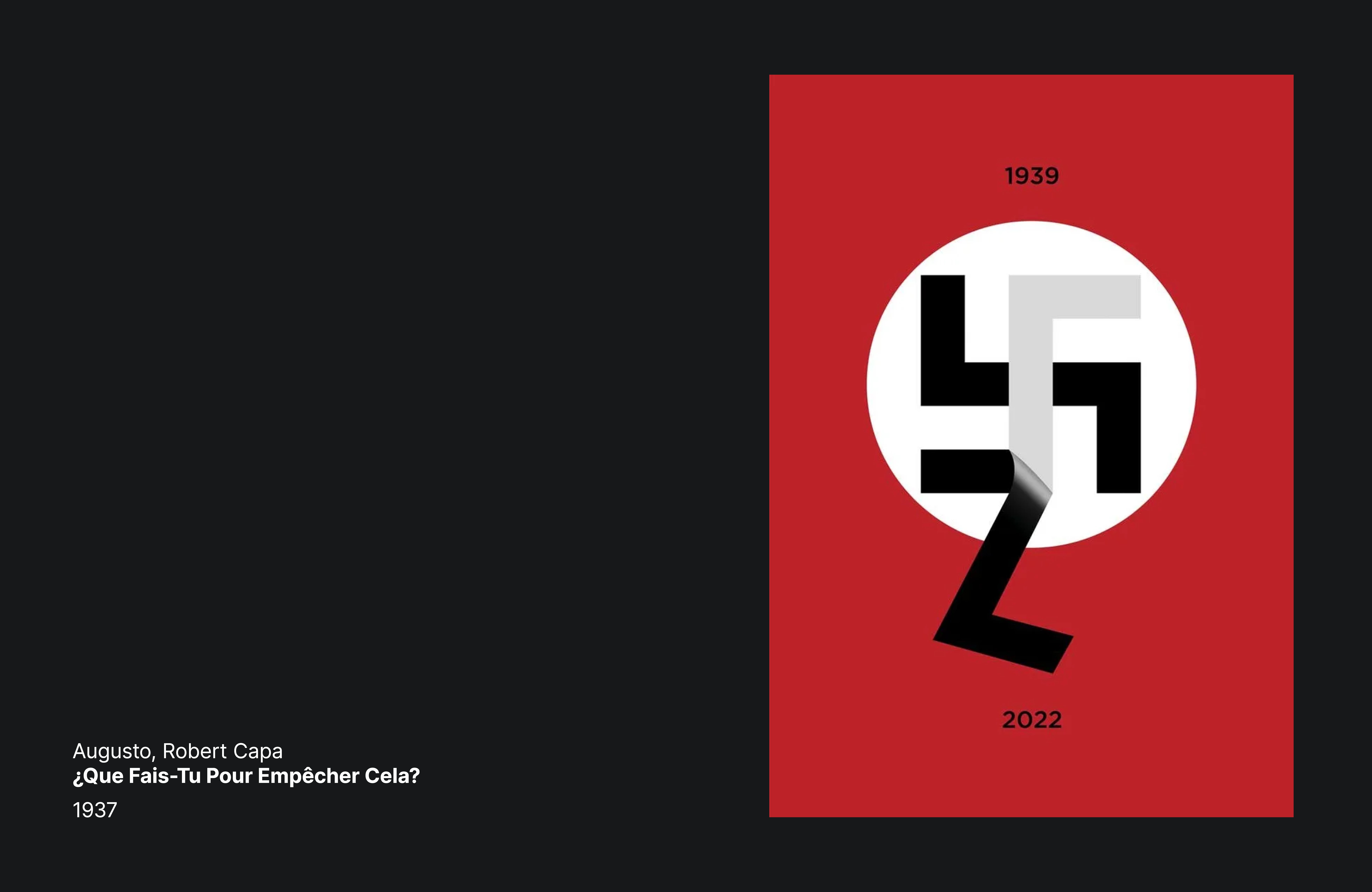 Created by Ukrainian designers who were forced to relocate due to the Russian invasion, this poster operates through immediate symbolism. A flat red field and white circle deliberately symbolise the Nazi flag, but the central black swastika is manipulated so that one arm peels downward into a “Z”. The letter Z has been seen in use by the Russian military for other purposes, but the Russian public have widely appropriated the symbol as a pro-war emblem. The subtle grey underside of the peeled stroke reinforces the idea of exposure or unmasking, visually equating past fascist aggression with present-day Russian militarism. The two dates compresses the comparison into two historical moments, relying on the viewer’s cultural literacy to understand the parallel. Its clean vector geometry clarity are key identifiers of modern design and expresses the need to communicate a global warning with as little language as possible.