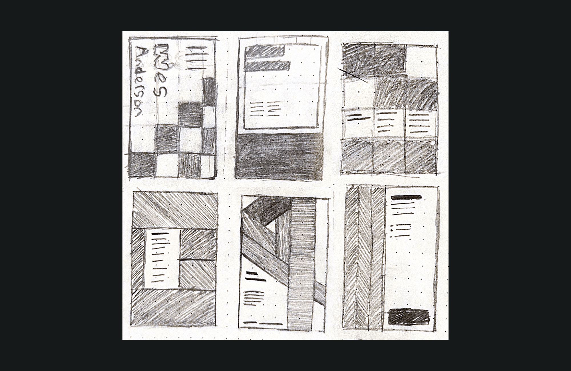 Straight away, I began sketching various ideas on how I could create a visually balanced layout that could allow me to add some form of symmetry without breaking too many rules of Swiss design. A big factor of course is asymmetry and flush left, ragged right text. Two things that push me further away from Wes Andersons style.