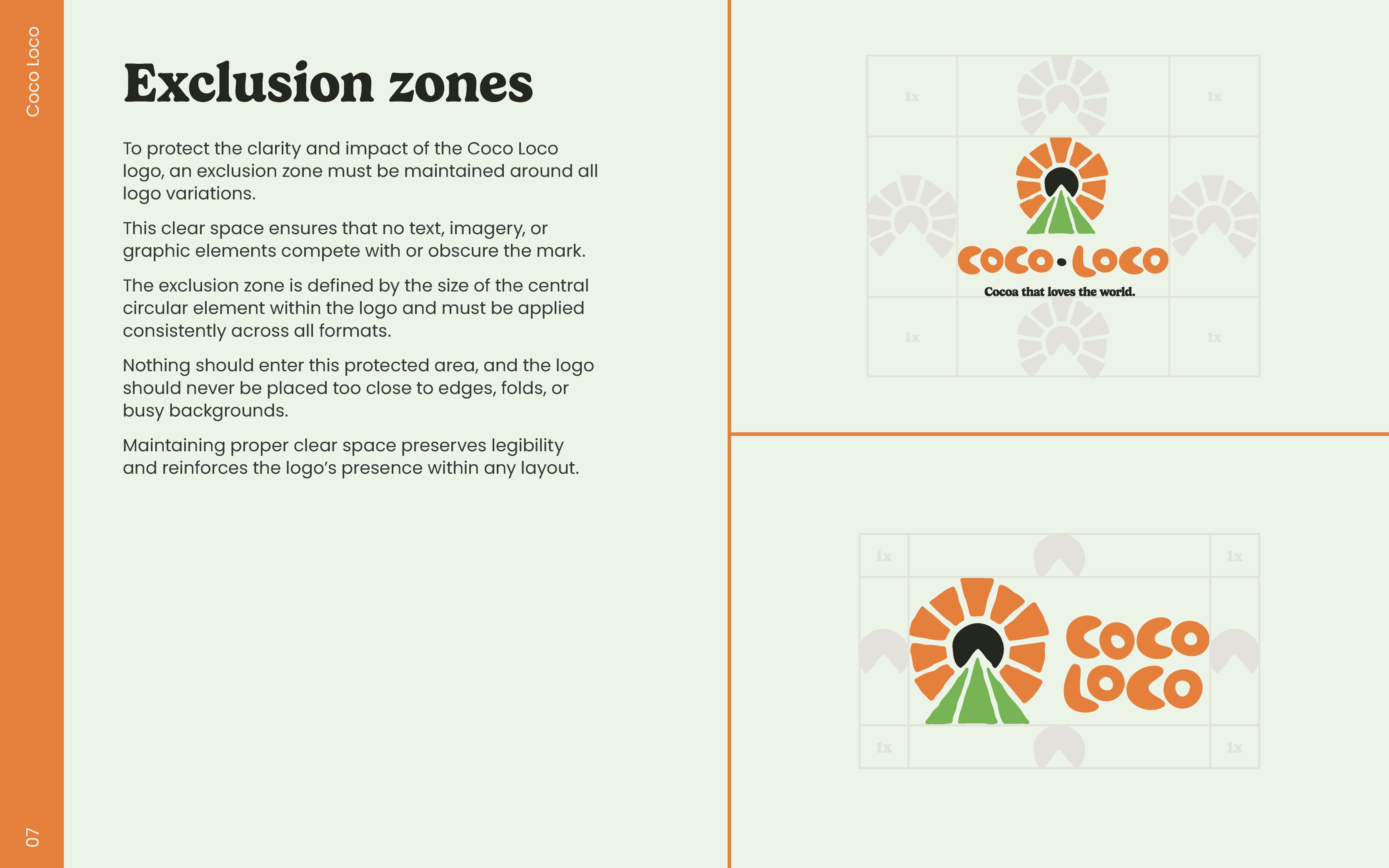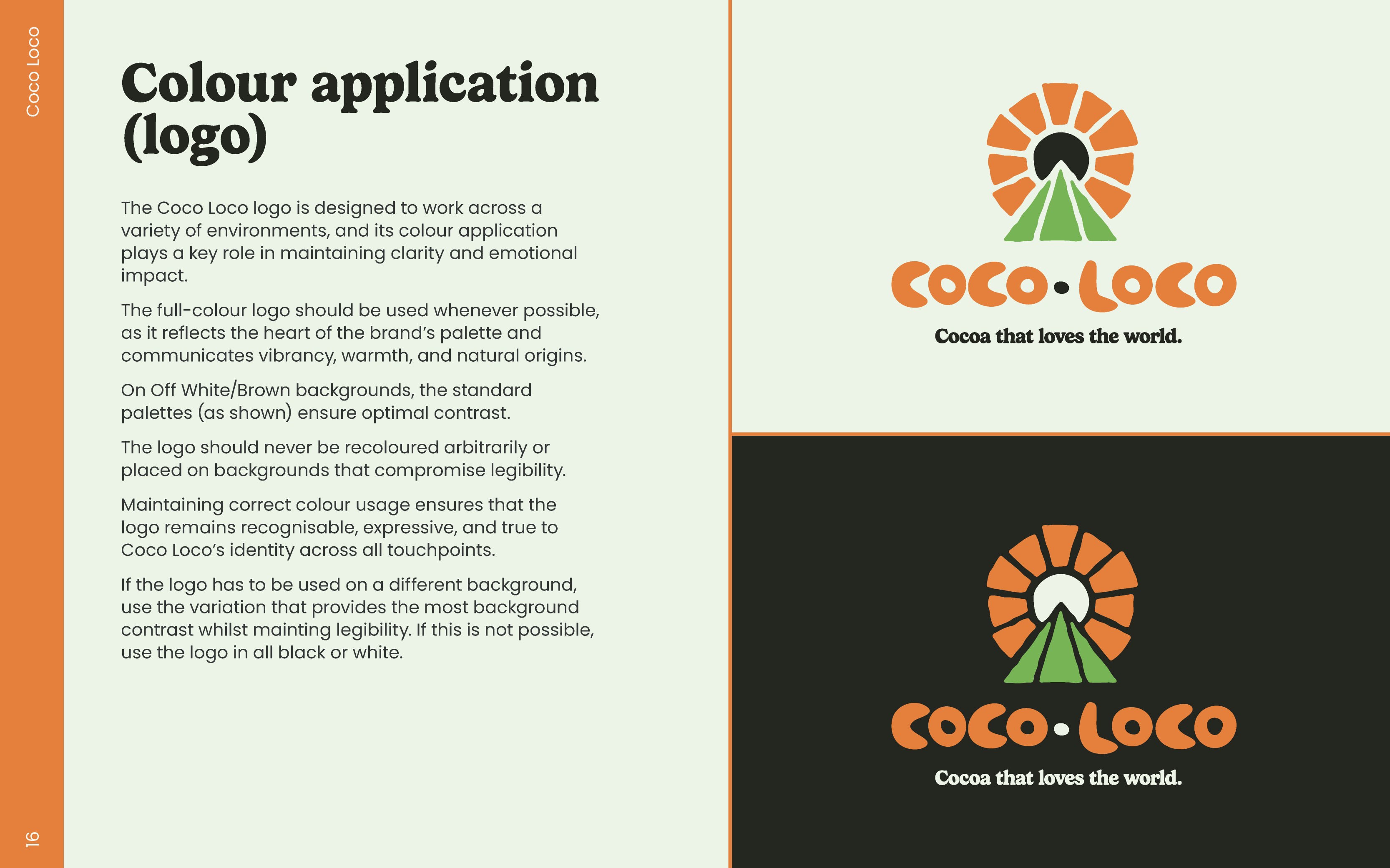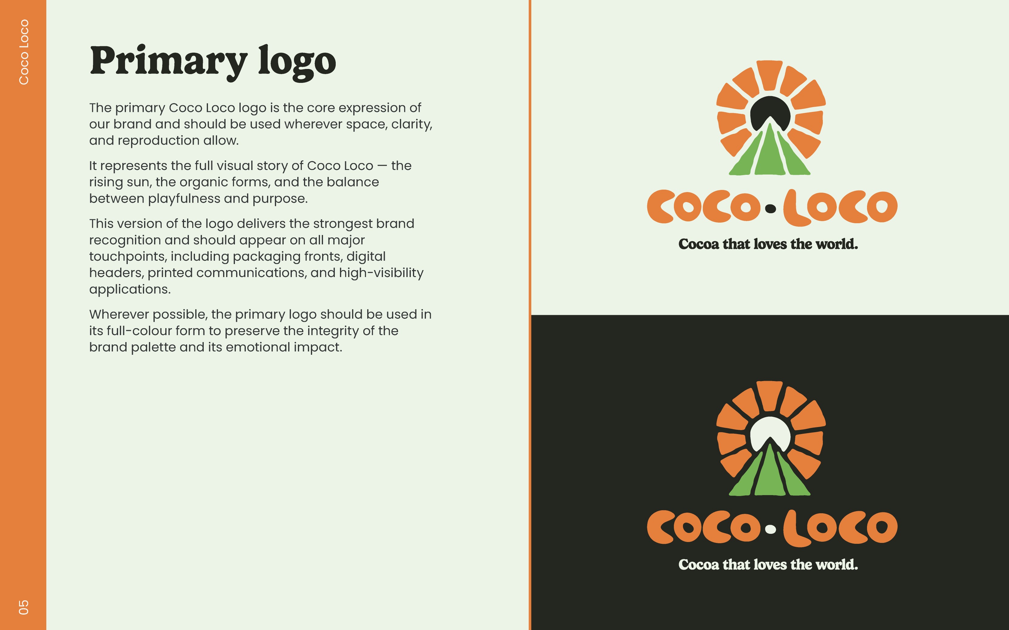 The first is the primary logo. When there's enough space, for example gift boxes, sleeves, or shippers, this logo will be used. When consumers see products for the first time, they need as much information from the logo as possible so they can make the correct preconceptions of Coco Loco. This logo can also be used without the strap-line if necessary.