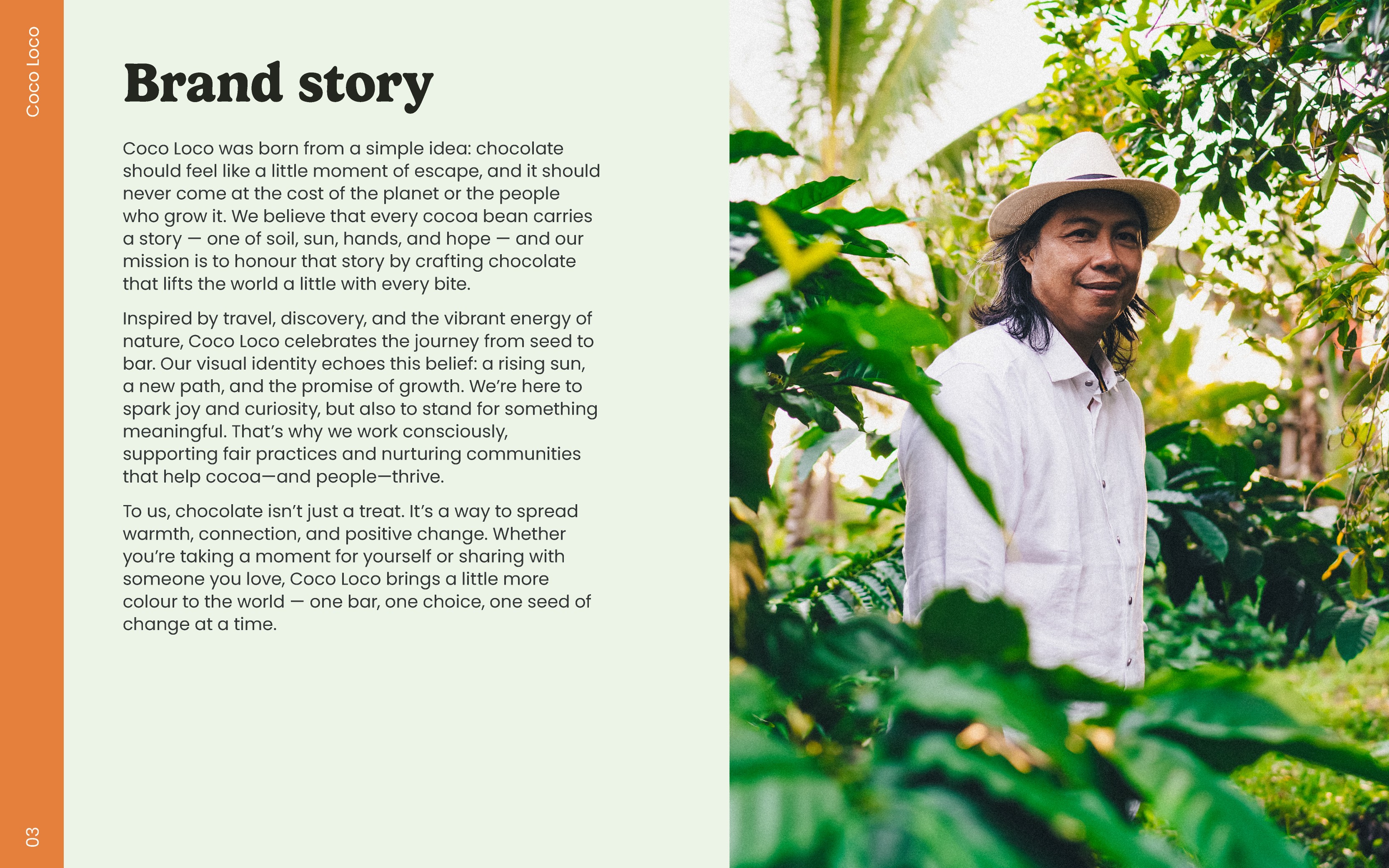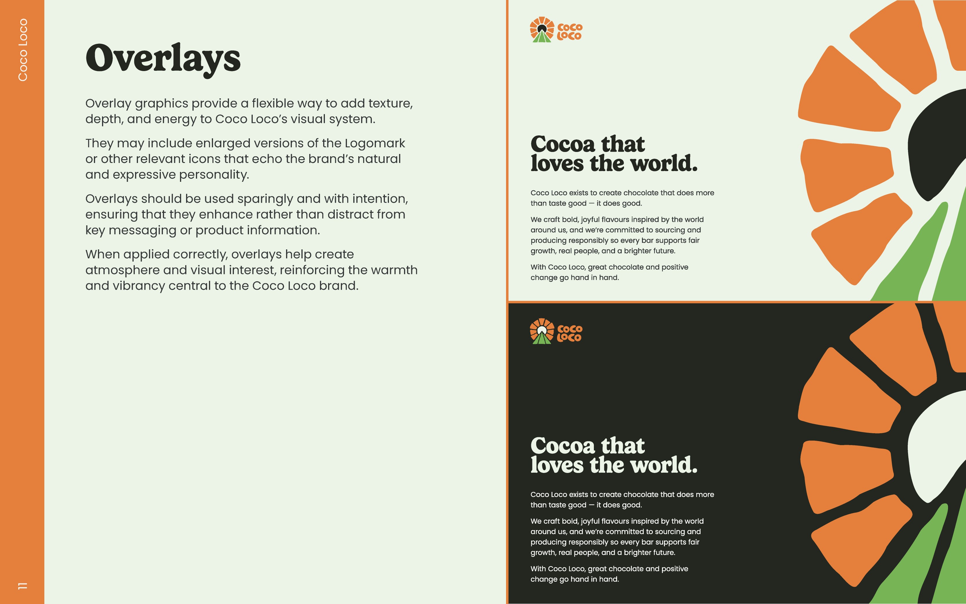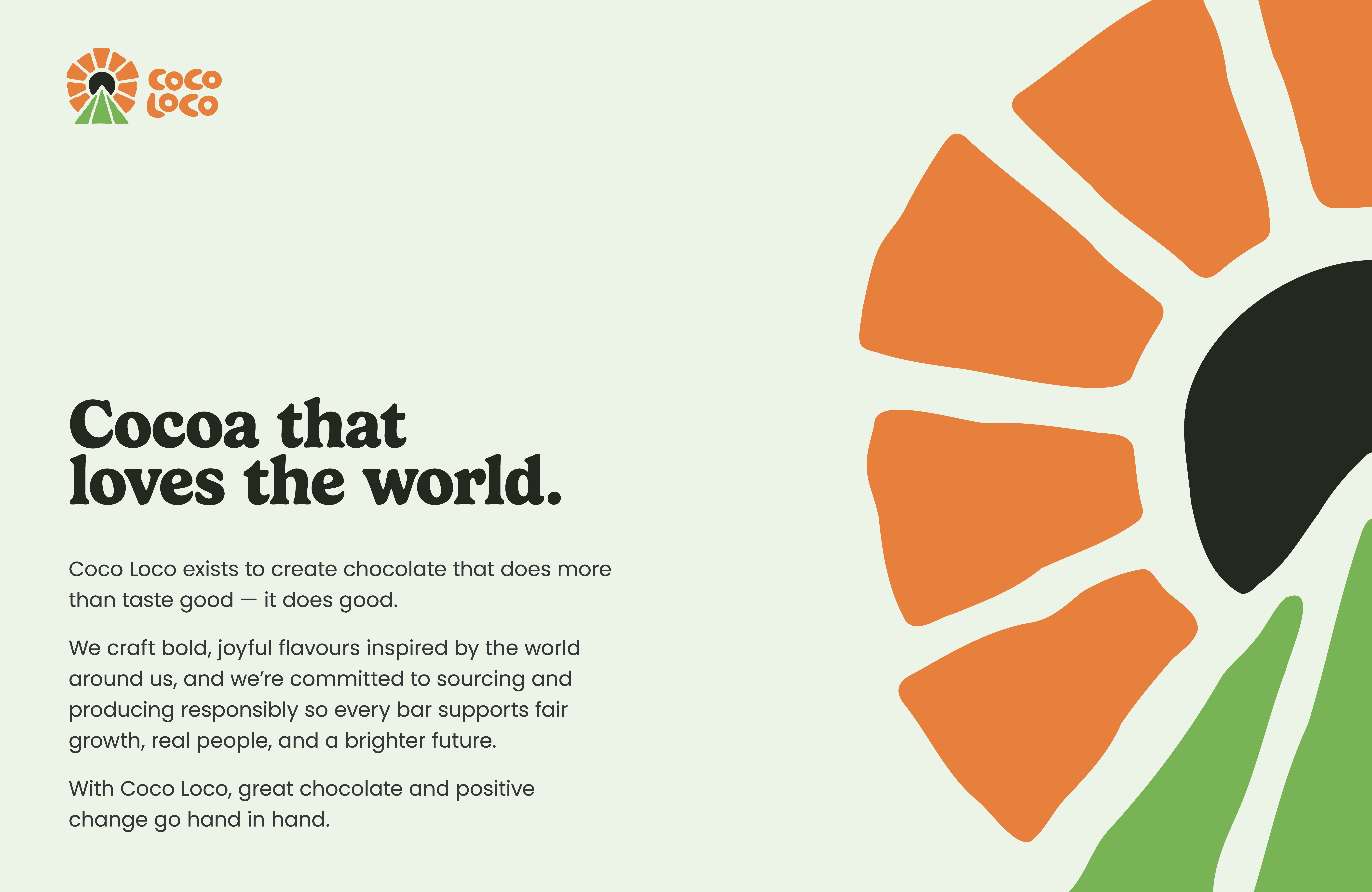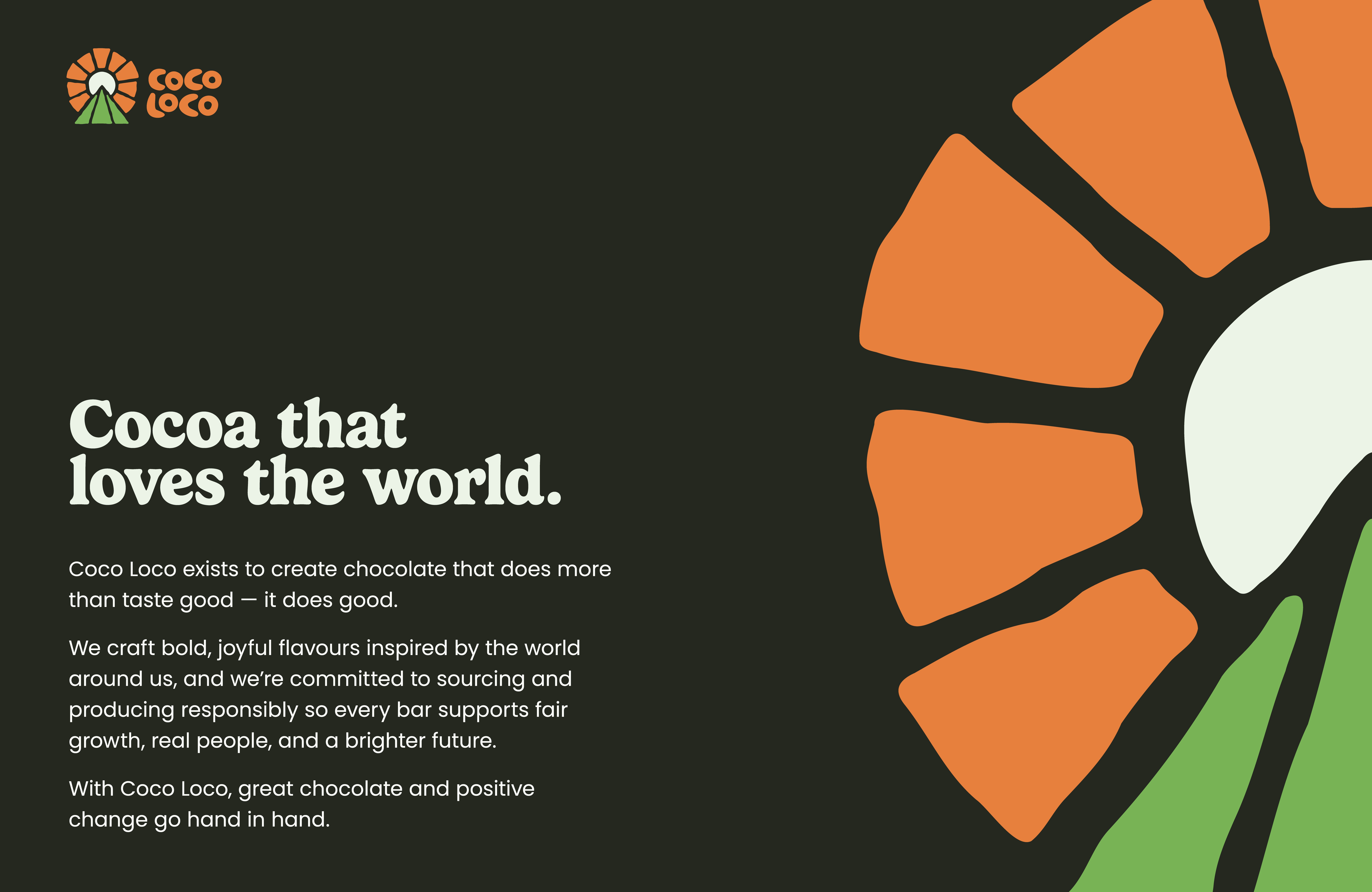The creative direction I want to take is along the same lines. Promoting a brand that supports in incredible cause in a way that speaks to the every day consumer without sounding like every other brand. It's quite simple, rather than telling everyone Cocoa Loco helps the world, help the world and let everyone see it for themselves. This is of course all hypothetical, but that's the idea behind the brand.